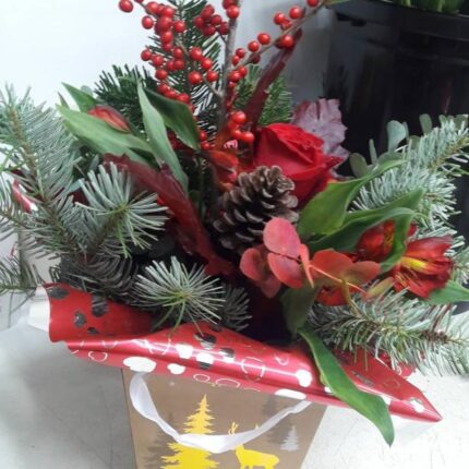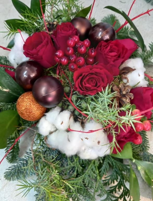 CHRISTMAS TABLE ARRANGEMENT OF MAIN RED TONALITIES WITH FRESH FLOWERS, COTTON FRUITS AND CHRISTMAS GREENERY. WOULD BE USED THE MATIERIALS AVAILBLE AT THE MOMENT OF DELIVERY, KEEPING THE ESSENCE OF THE PICTURE.