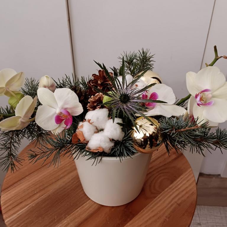 A LONG LASTING ARRANGEMENT MADE WITH CHRISTMAS GREENERY AND DECO ITEMS, FLOWERS OF ORCHID IN WHITE, PINK OR PURPLE AND A CERAMIC POT IN MATCHING COLOURS WITH THE FLOWERS.