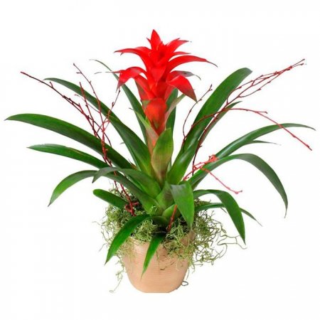 GUZMANIA PLANT HAS A LONG LASTING FLOWER, WE AND TO IT BARE BRANCHES AND DECORATIVE POT IN MATCHING COLOURS, AND GIFT WRAPPED