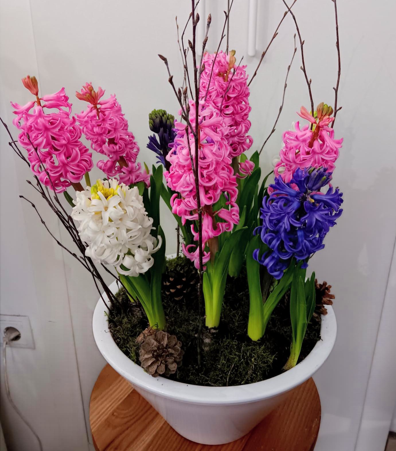 CONTAINER WITH HYACINTHUS OF DIFFERENT COLOURS , GREENS AND BRANCHES, A LOVELY GIFT AT THIS TIME OF THE YEAR.