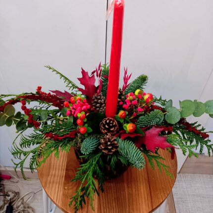NUESTRA CESTA DE BOMBONES Y VINO DECORADA PARA NAVIDAD AL ESTILO DE UN FLORISTA, EMPLEANDO VERDES NATAURALES, PIÑAS Y RAMAJES, ASI COMO UNA PLANTA DE ESTACIÓN (BREZO, CICLAMEN, ETC…) SEGUN DISPONIBILIDAD