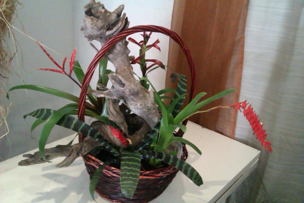 UN HERMOSO REGALO DE LARGA DURACION POR 79,90 TODO INCLUIDOCESTA FORMADA POR TRES-CUATRO BROMELIAS Y PLANTAS AFINES VARIADAS DECORADAS CON MUSGO Y TRONCOS DECORATIVOS MONTADAS SOBRE UNA CESTA DE 25-30 CMS DE DIAMETRO