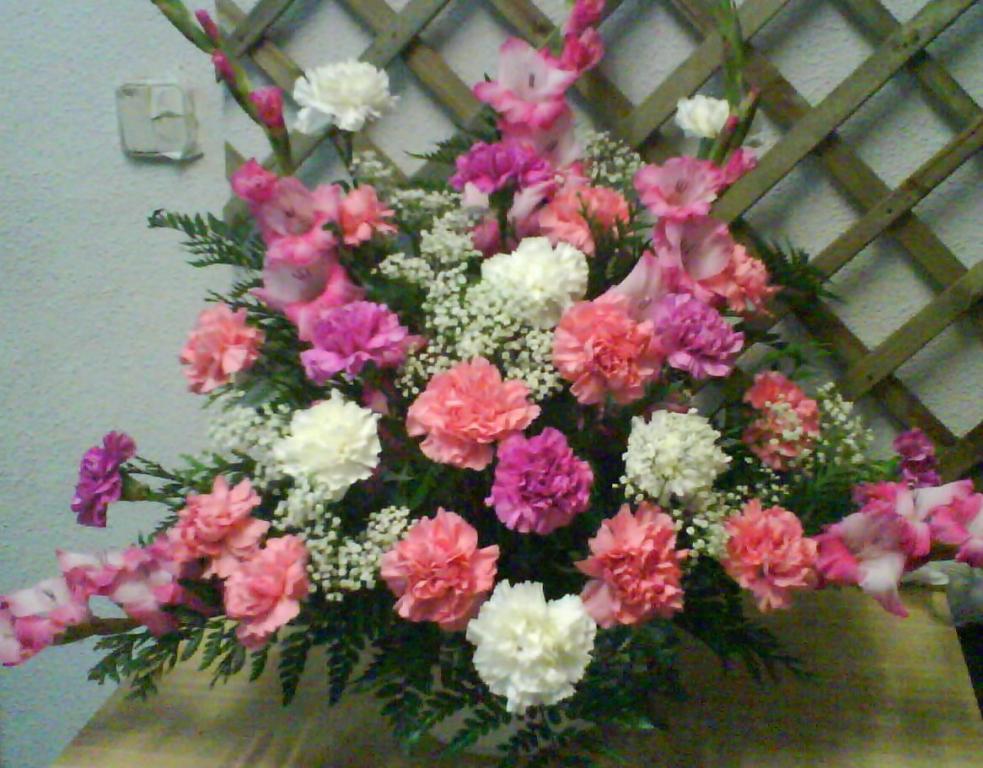 CENTRO ELABORADO CON CLAVELES VARIADOS Y GLADIOLOS ROSADOS