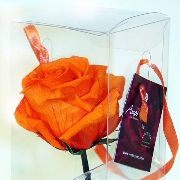 ROSA PRESERVADA NARANJA DE 50 CMS EN CAJA TRANSPARENTE. Rosa eterna color naranja, irradia luninosidad como el sol, alegra la estancia con su resplandor.