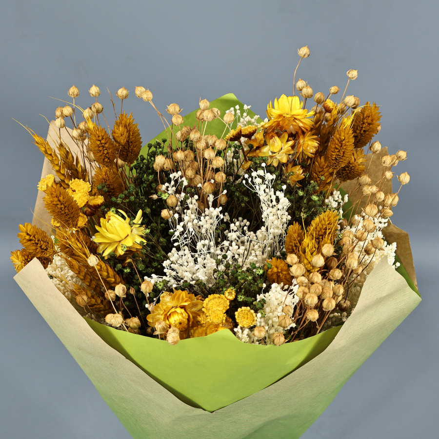 PRECIOSO RAMO DE FLORES CAMPESTRES PRESERVADAS EN TONOS AMARILLOS, VERDES Y PAJIZOS, NO NECESITAN AGUA.