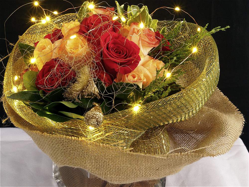 BRILLANTE BOUQUET DE ROSAS DE NAVIDAD CON GUIRNALDA DE LUCES LED, ENVUELTO CON PAPEL DE REGALO Y LAZO NAVIDEÑO