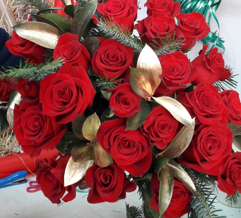ROSAS ROJAS Y RUSCUS DORADO LOS COLORES PERFECTOS PARA DESEAR LO MEJOR PARA EL AÑO NUEVO QUE COMIENZA.